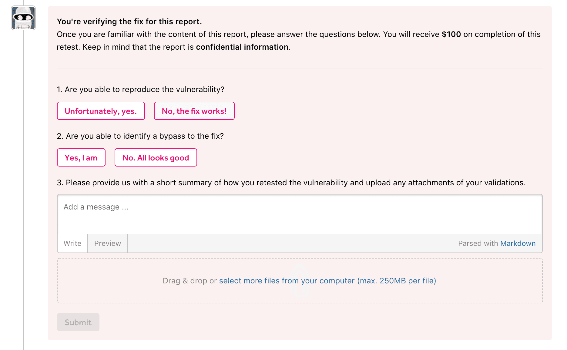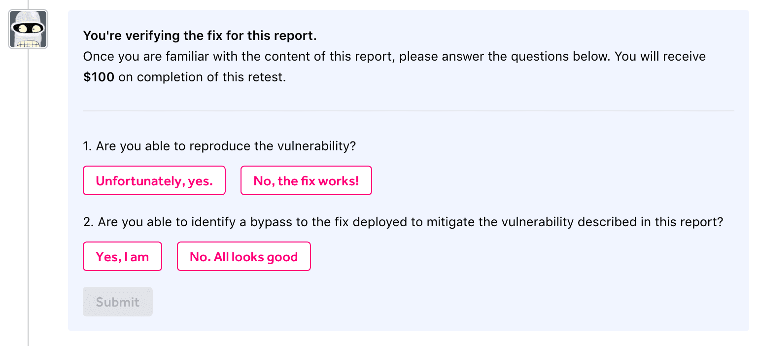 Programs can now elect to invite hackers to retest their vulnerabilities to verify fixes. Each hacker that participates in the retest will receive a $100 bounty upon completion. Learn more about retesting.