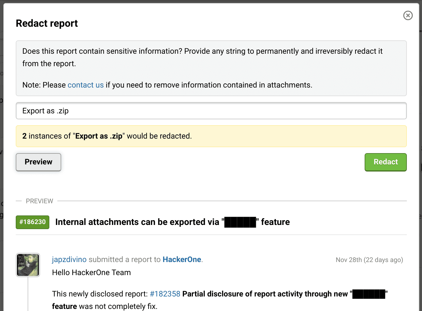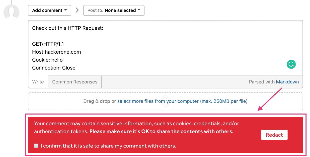 To better protect your sensitive information, we now provide a suggested redaction notification when your report comments contain sensitive information such as cookies, credentials, and authentication tokens.