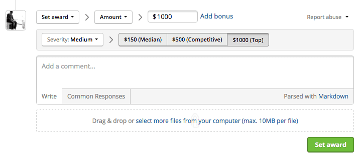When programs award a bounty, we now automatically show them the median, competitive, and top level bounty across the platform for the severity of the vulnerability they are awarding a bounty for. This helps programs to gauge their reward competitiveness and to be as consistent as possible in awarding bounties.