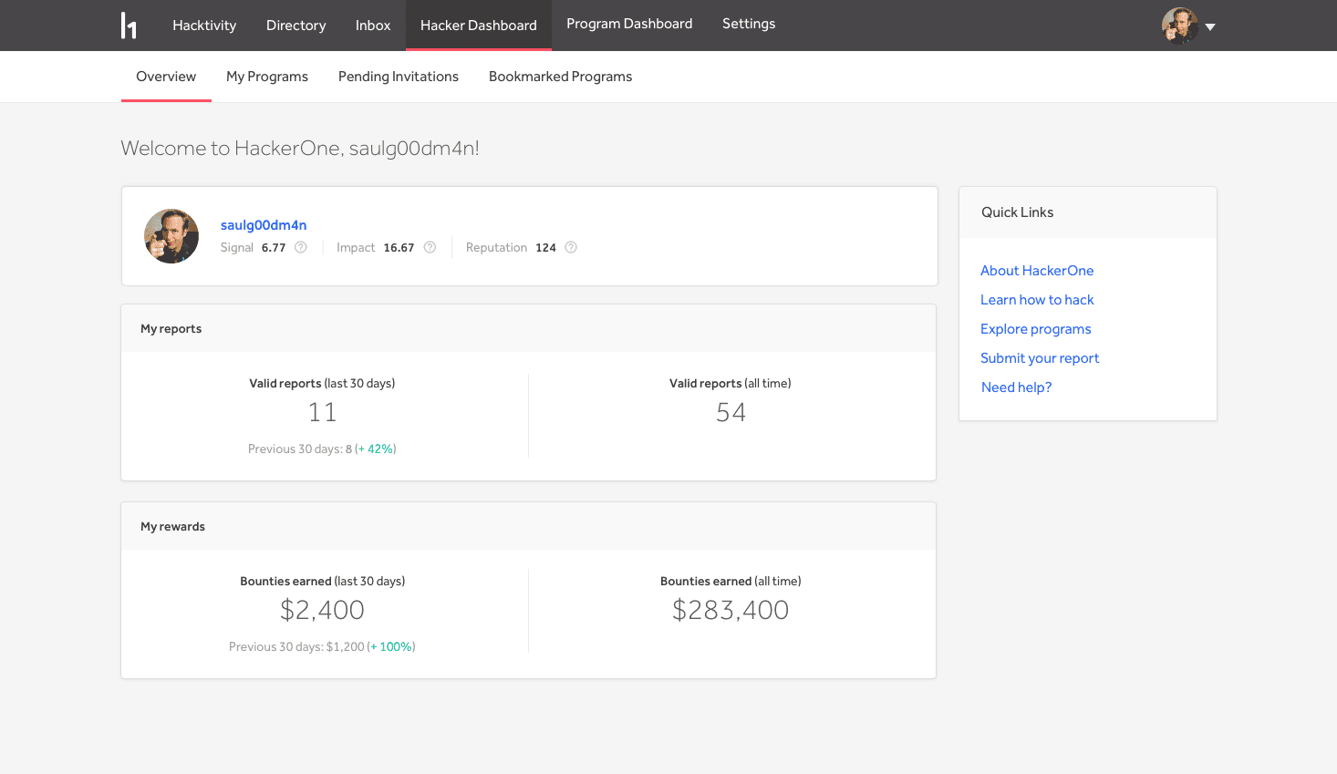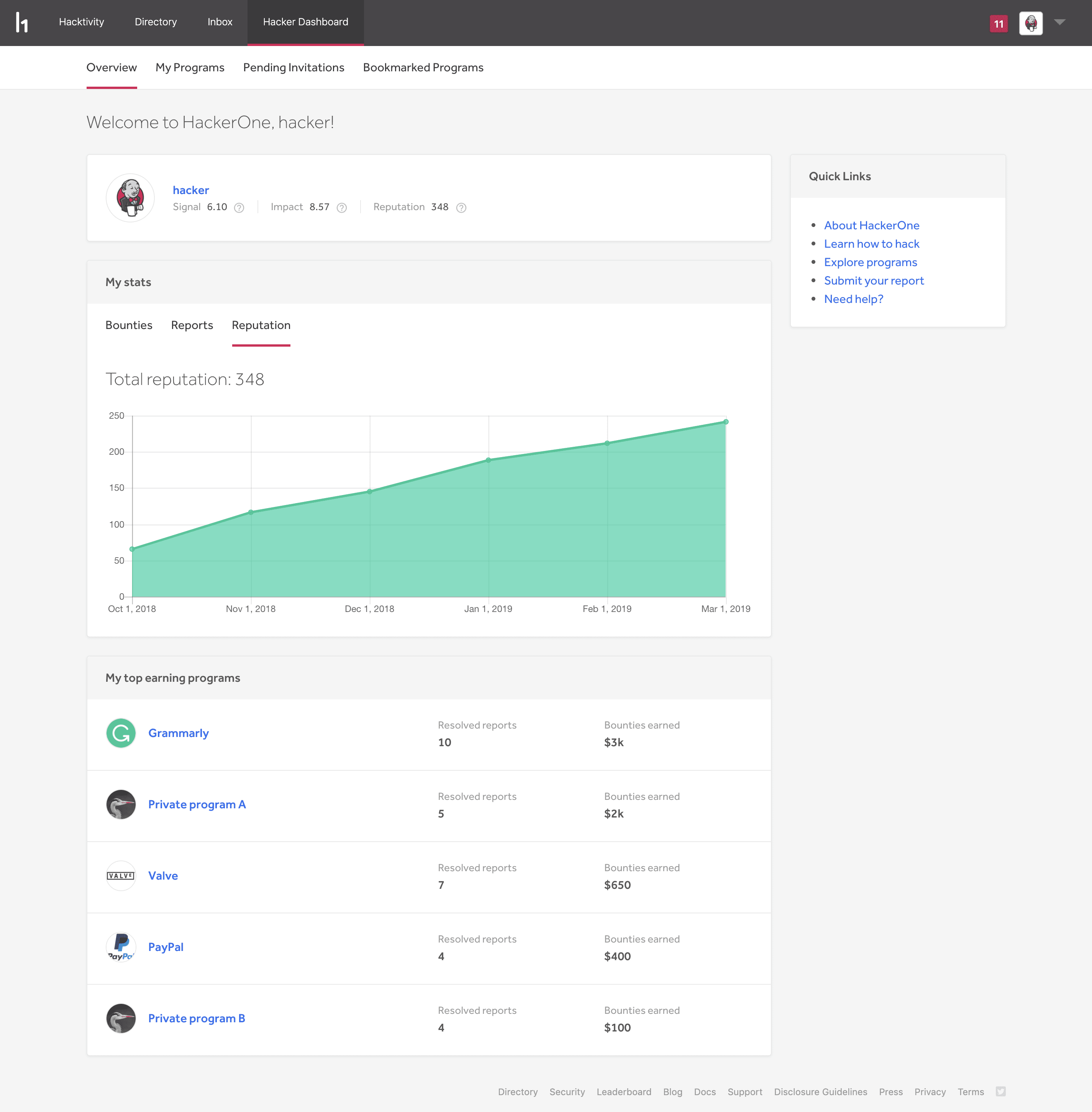 We've revamped the My Stats section of the Hacker Dashboard with expanded graphs where you can view your bounties, reports, and reputation over time. We've also included a new My top earning programs section to help hackers see which programs they're earning the most bounties from.