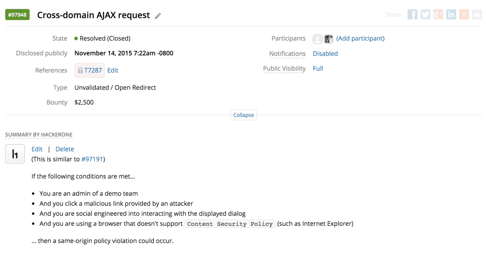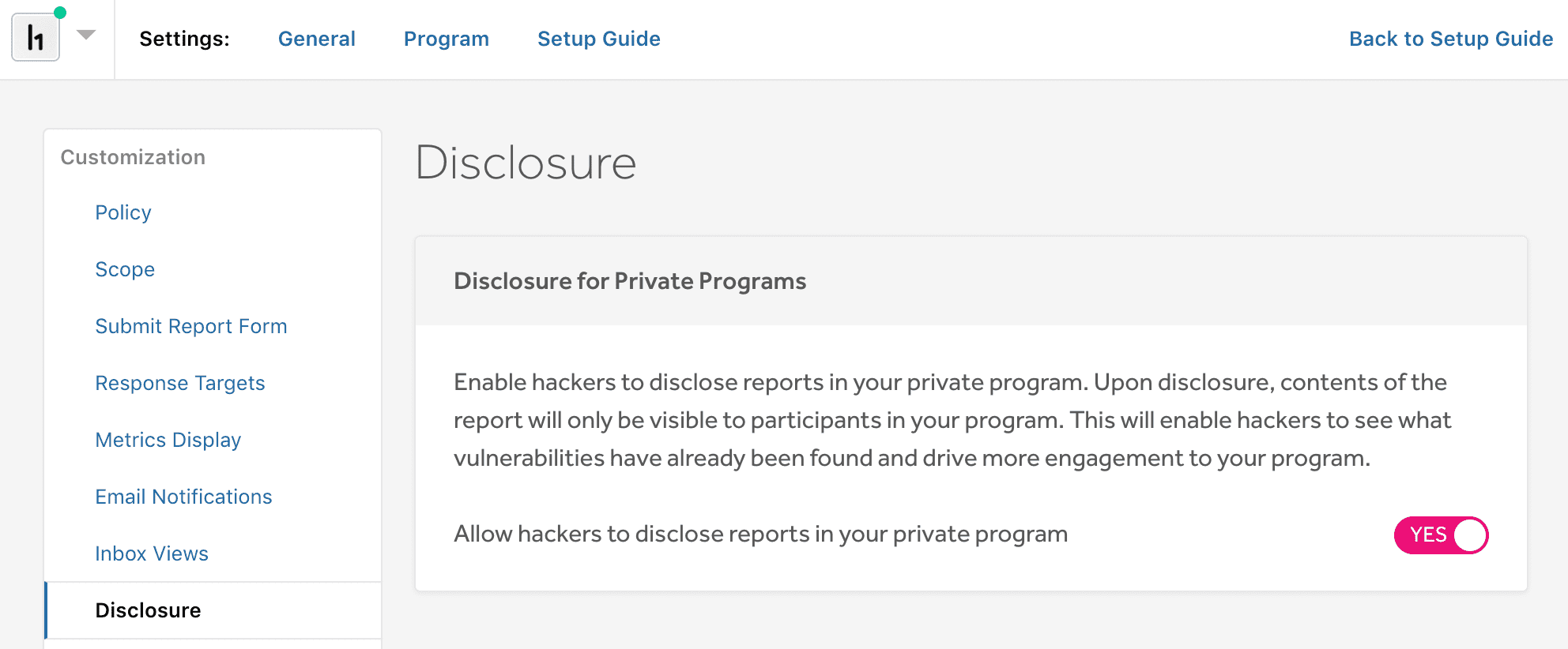 Private programs can now opt-in to enable hackers to disclose reports to other hackers within their program. Upon disclosure, contents of the report will only be visible to participants within that private program. This enables hackers to share their vulnerability findings with other hackers in the program, and can also increase awareness for other hackers as they can better see what vulnerabilities have already been found for the program.