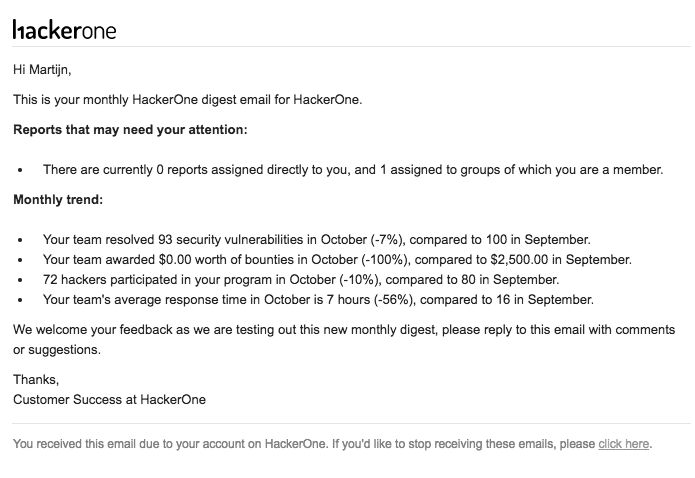 We’ve implemented monthly digest report emails so that if a user is a member of an active HackerOne program, they’ll be able to see how their program is performing and gain insight into any changes to their program. They’ll receive this email every first business day of the month.