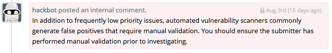 We’ve updated our report classification engine to detect common outputs from automated vulnerability scanners that are frequently flagged as invalid. This enables the quality of report submissions to improve as hackers can check the report before submission.