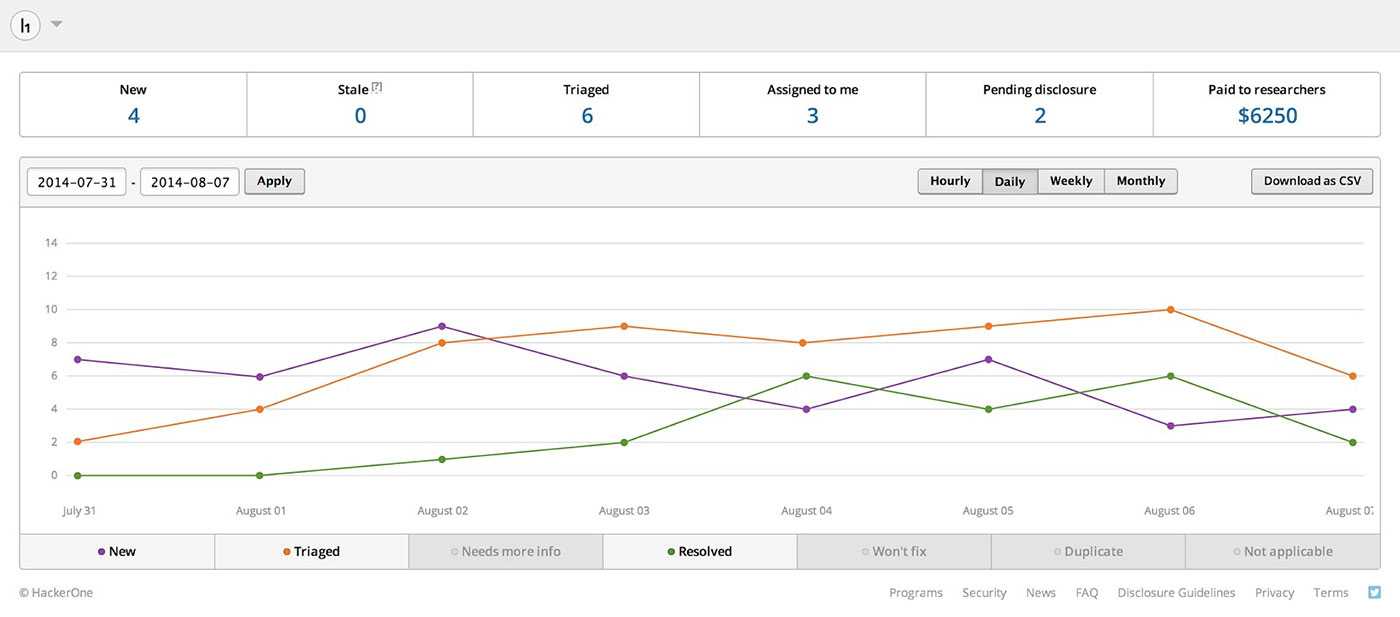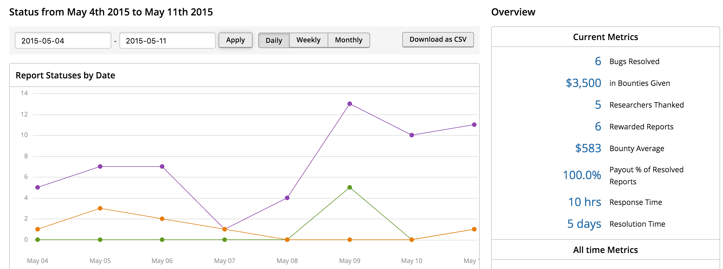 We enable programs and hackers to export their reports as .CSV files to enable them to quickly generate a spreadsheet of selected reports with key details.