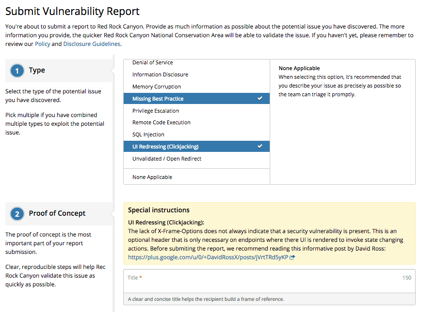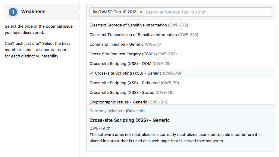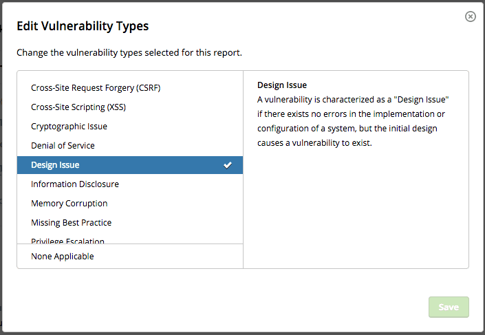 Programs can now customize their report submission forms with their own introduction text and the ability to hide and disable vulnerability types.