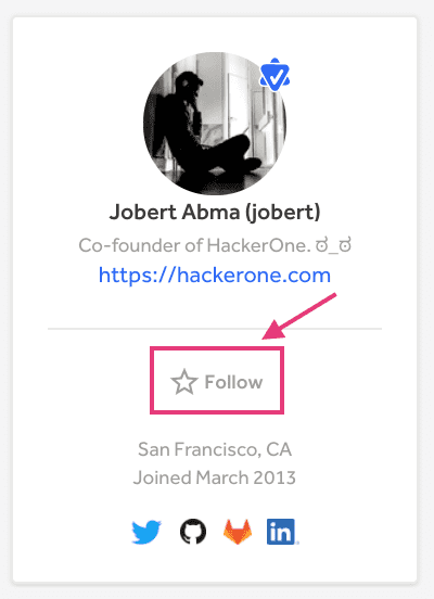 In order to keep up-to-date with your favorite hackers, we introduce the new Hacker Following feature. This enables you to keep track of your favorite hackers and to quickly see their activity on HackerOne.
