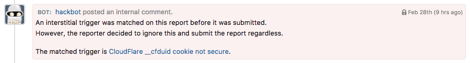 We’ve updated our triggers functionality so that an interstitial shows prior to report submission. This helps hackers to avoid the submission of a number of out-of-scope or commonly reported false positives.