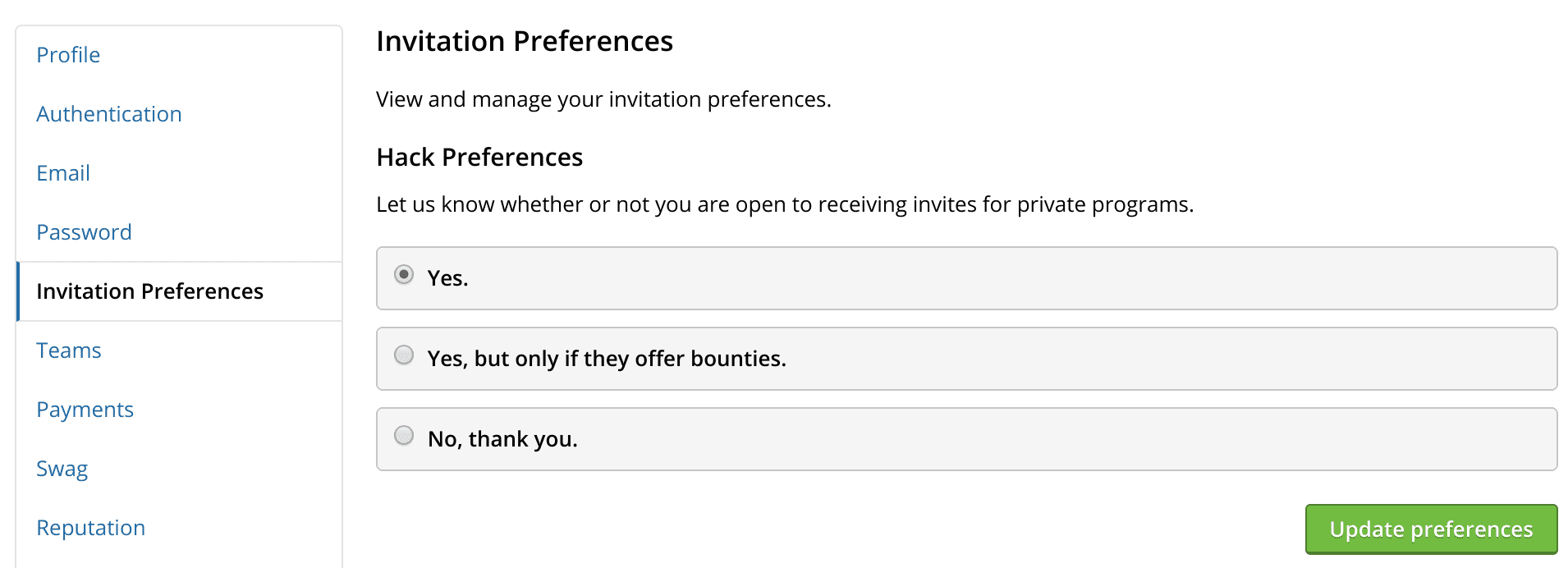 You can now clearly define whether you're a hacker or someone running a program within the new Account Preferences tab under your profile settings. This will help tailor your HackerOne experience to better fit your needs.