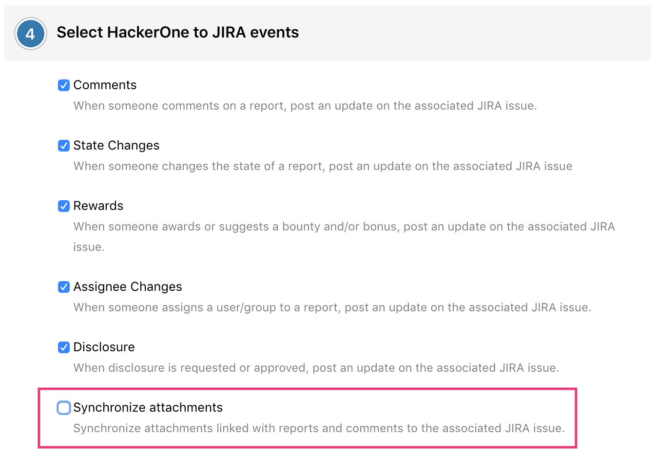 Jira users can now sync attachments from their HackerOne report to Jira by selecting Synchronize attachments in the Select HackerOne to Jira events section when configuring their Jira integration.