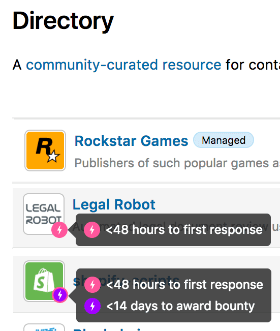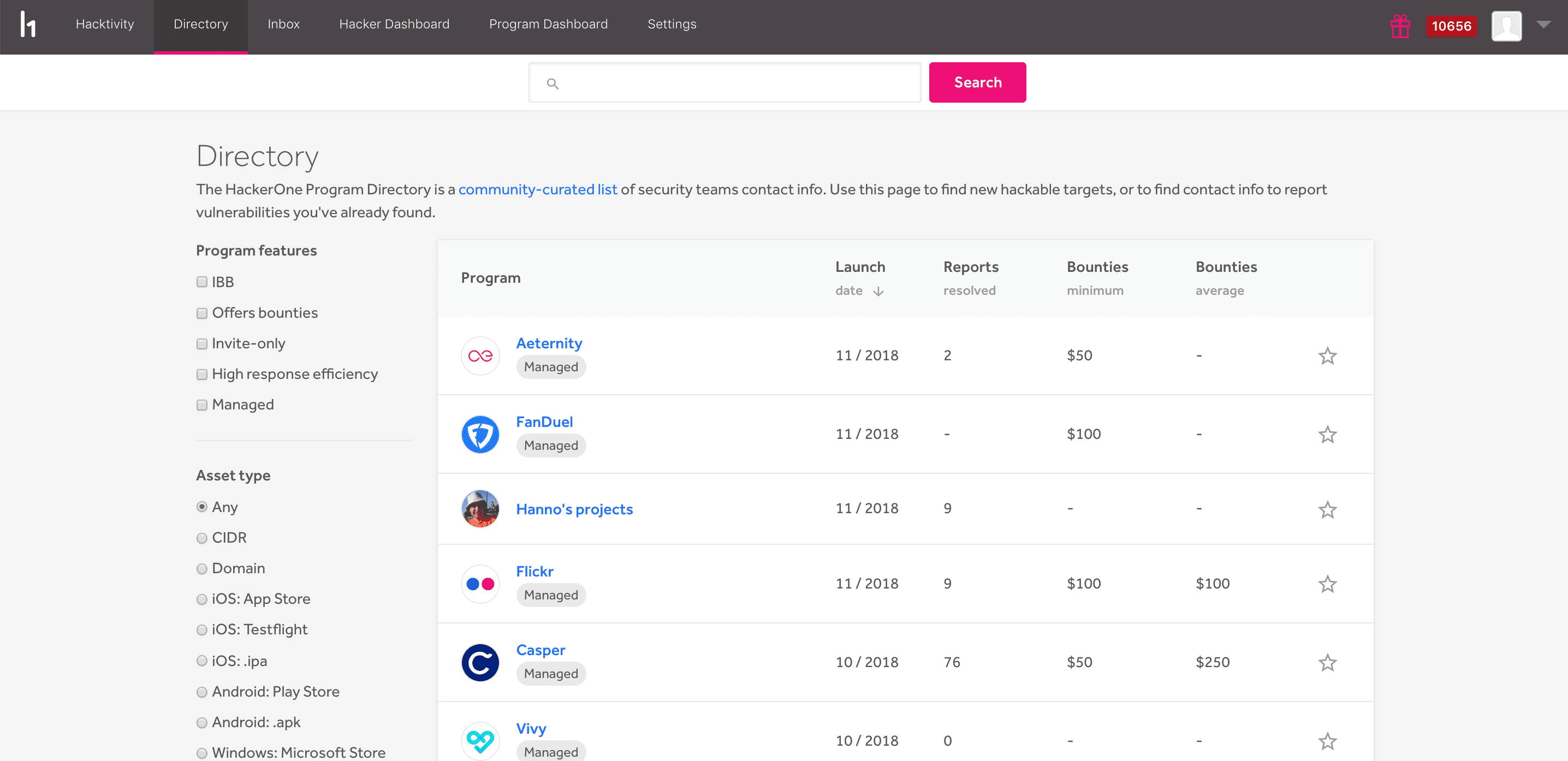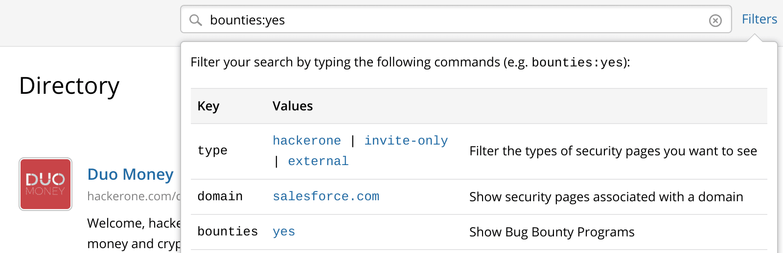 Users can now filter the directory by programs offering bounties. Type bounties:yes into the search bar to only view the bounty programs in the directory.