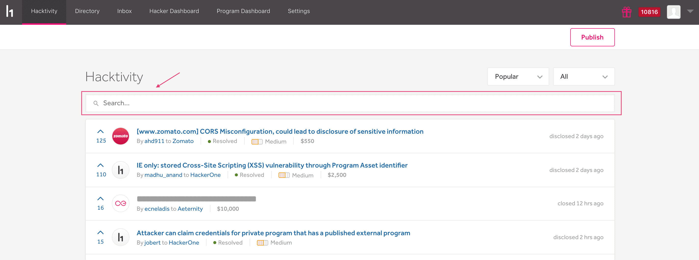 We now enable you to search within Hacktivity. You can search for reports regarding programs and weaknesses you're interested to read about in the search bar to better learn how specific weaknesses were exploited in various programs.