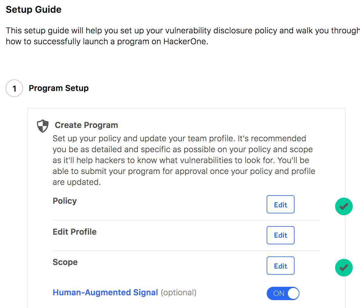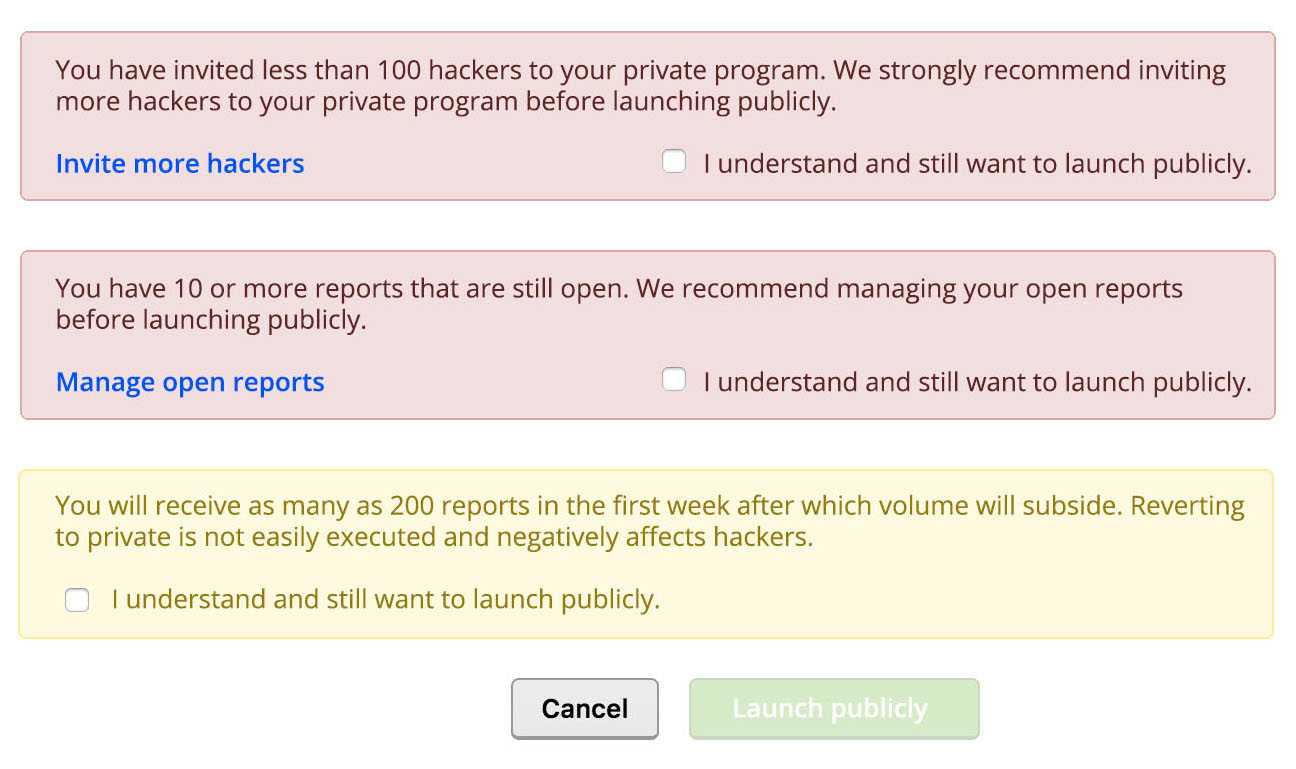 We now set clearer expectations for self-managed programs that decide to publicly launch their program without having met the launch criteria. We supply warning messages showing that the program hasn’t met the recommended criteria and also require them to select the checkbox acknowledging that they haven’t met the criteria but still want to launch publicly.