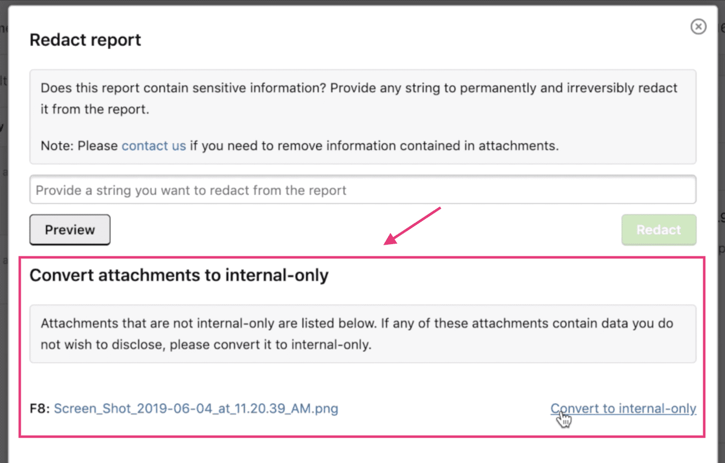 You can convert attachments to be internal for all redactable reports in the Convert attachments to internal-only section when redacting a report.