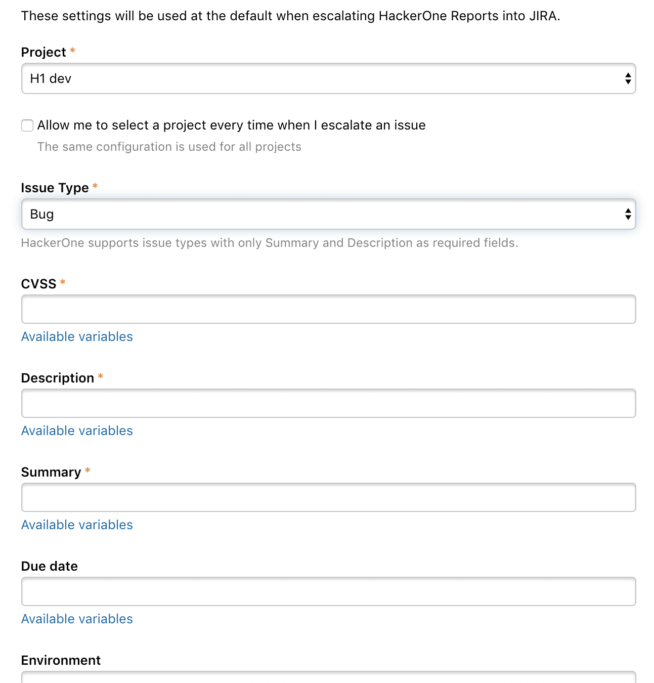 The HackerOne to Jira escalation template now includes all additional fields that are either a type of string, number, or date. This enables Jira users to have all fields in Jira be mapped to a value from the HackerOne report. All available Jira fields will automatically be pulled from the selected issue type.