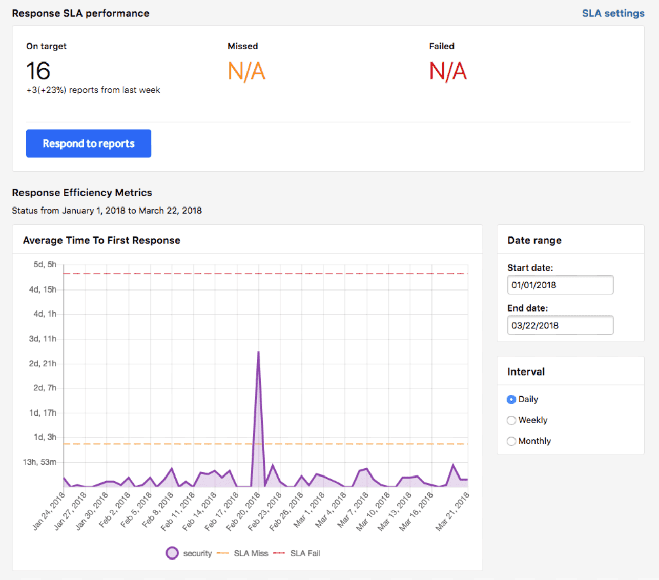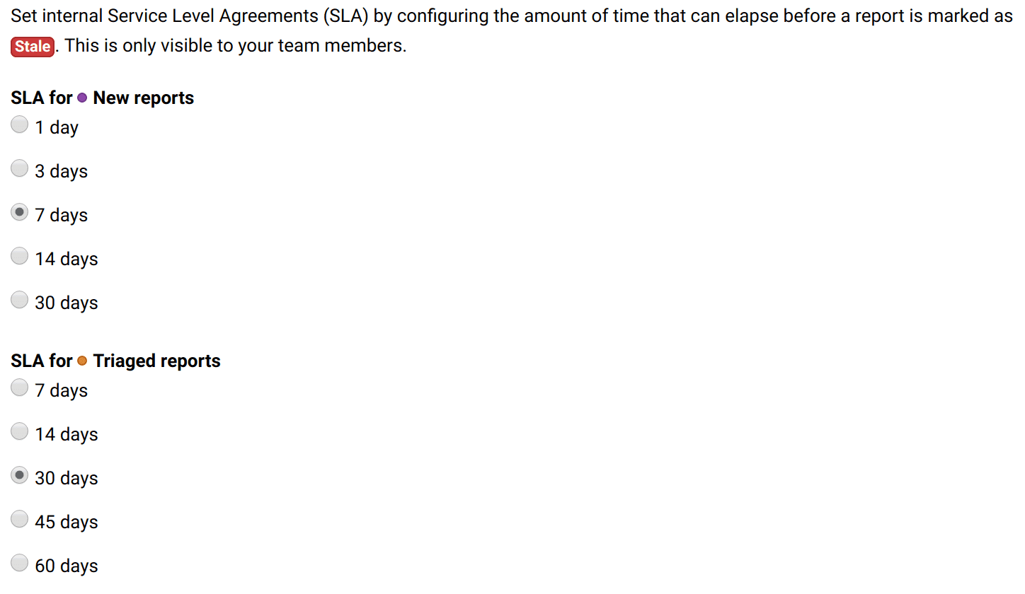 We enable programs to set internal Service Level Agreements (SLAs) by configuring the amount of time that can elapse before a report is marked for their program.