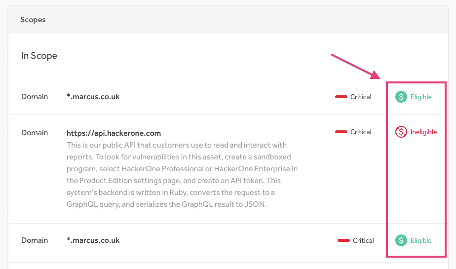 We've updated the structured scopes table on the program policy page with a new bounty eligible and ineligible icon to clearly show which assets are eligible and ineligible for bounties.