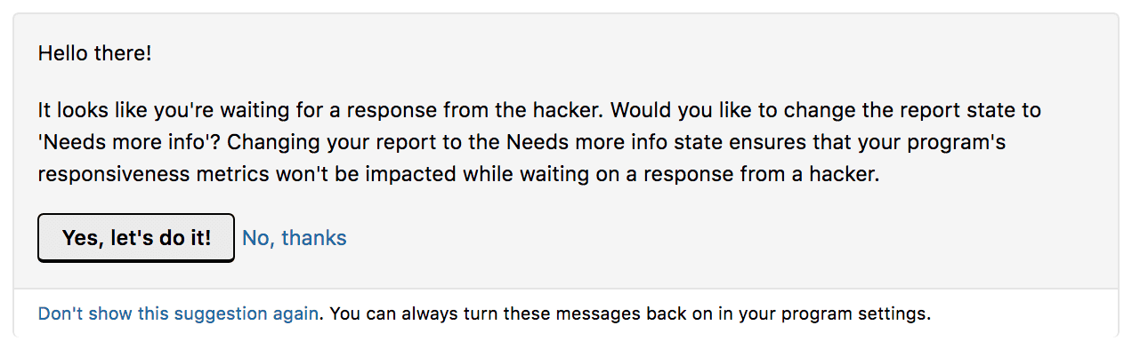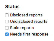We’ve added a ‘Needs first response’ filter to the inbox so that all reports that are still waiting on a public response to the hacker. This helps programs to optimize their time to first response.