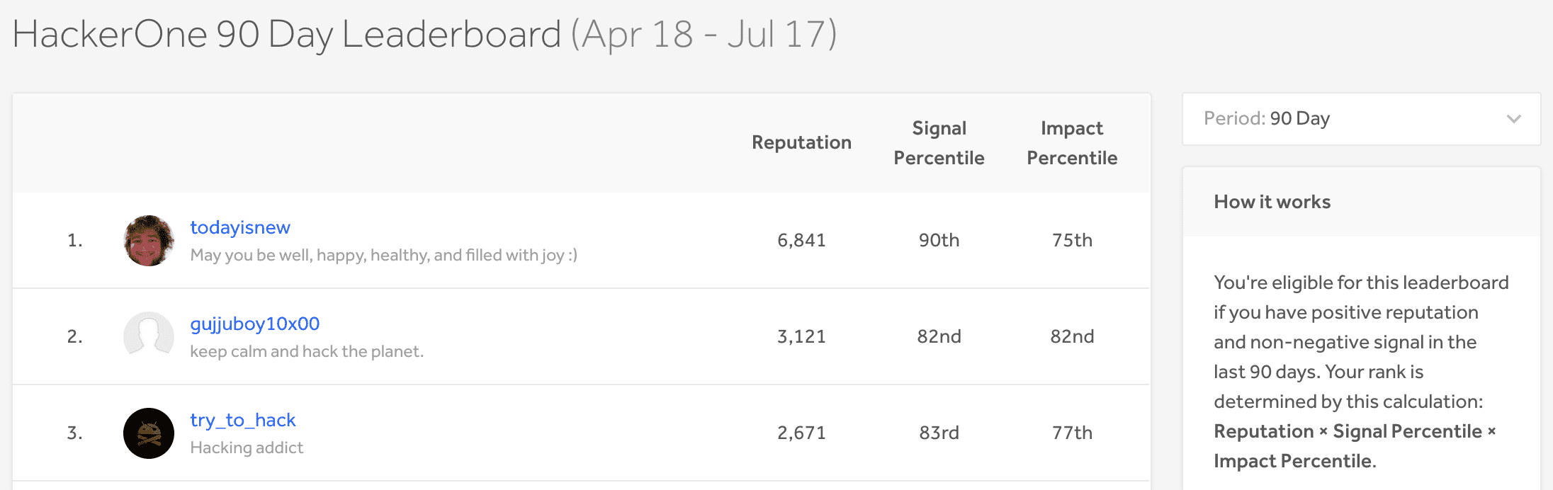 We’ve deprecated the Thanks page at https://hackerone.com/thanks and turned it into a hacker leaderboard that’s segmented into more granular time periods and sortable by Signal, Impact, and Reputation. See who’s on top here.