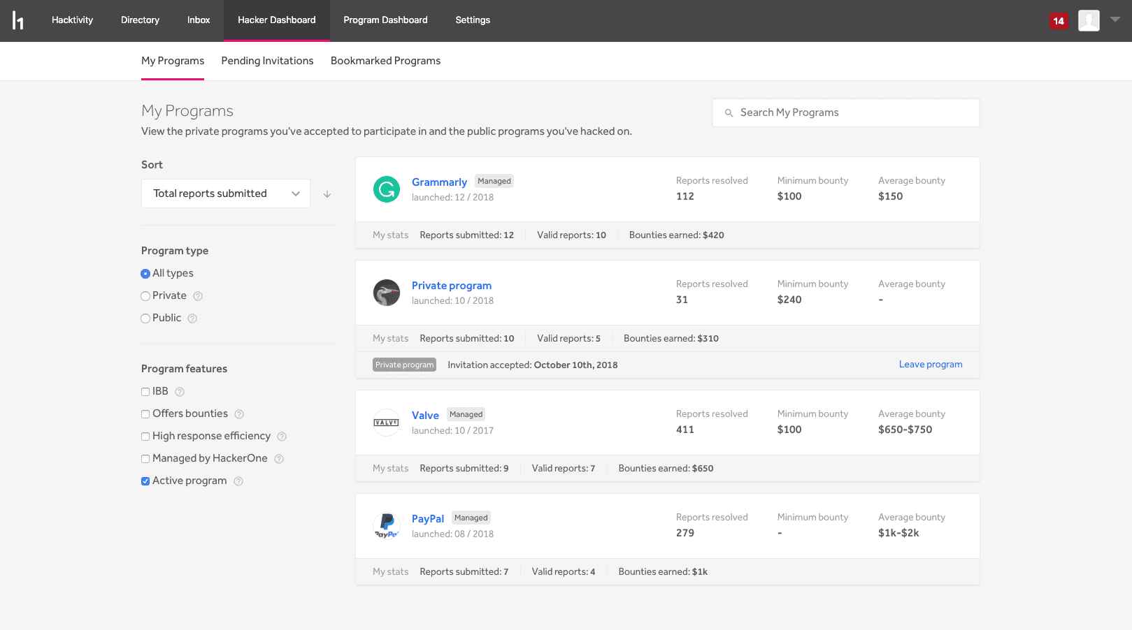 We’ve renamed the Accepted Invitations page on the Hacker Dashboard to now be called My Programs. We’ve also revamped the page so that hackers can better manage all of the programs they’re a part of by including:
