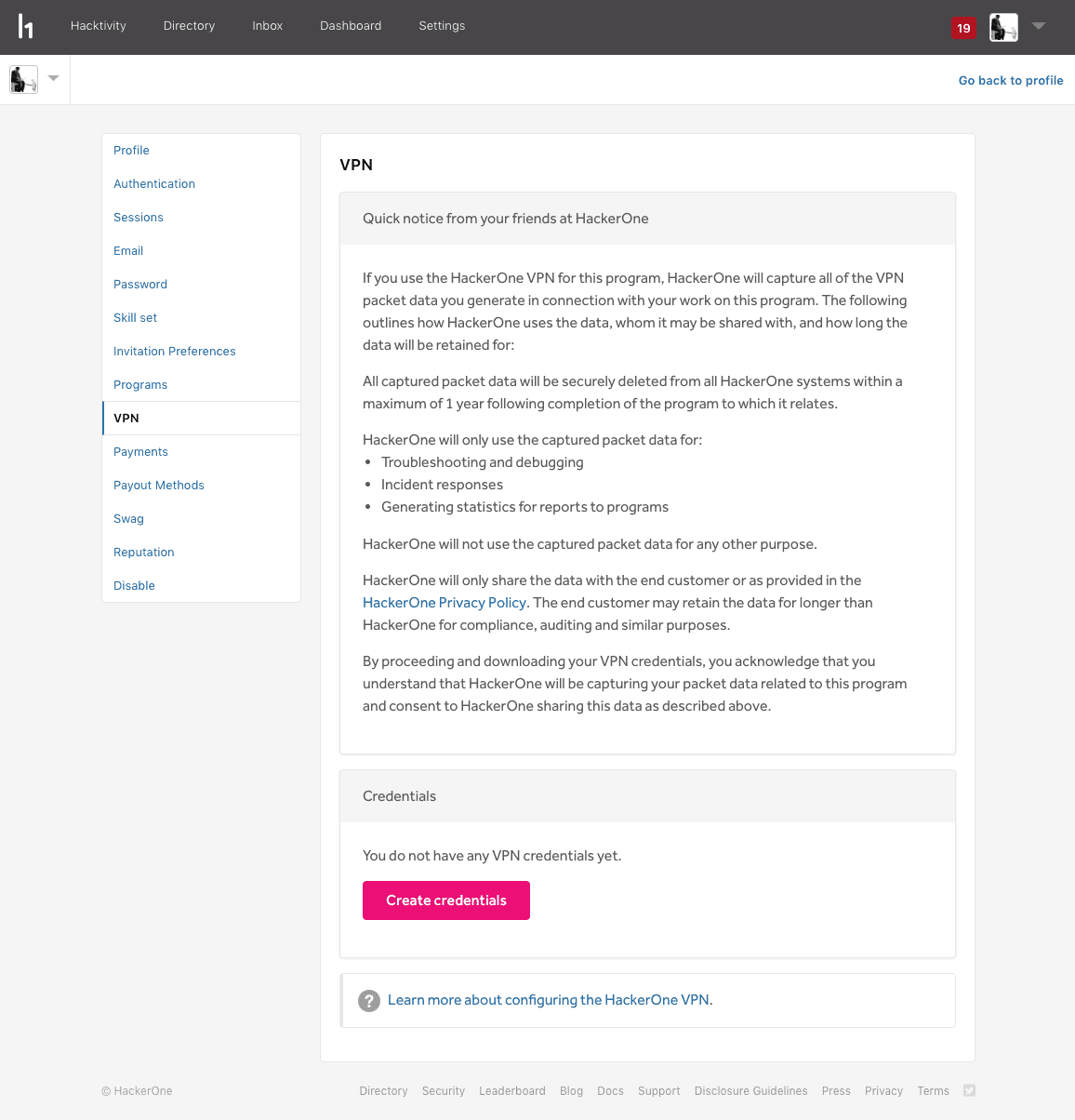 Hackers can now configure the HackerOne VPN and access their VPN credentials for VPN enabled programs.