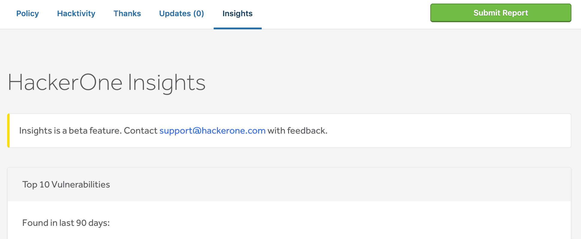 We introduce the insights page to provide hackers with helpful statistics about programs they're contemplating to hack on. The information is provided to help hackers focus their efforts on the right assets for the right programs. Categories of insights include: