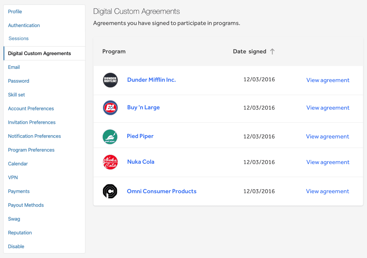 Hackers can now view their signed custom agreements on the new Digital Custom Agreements page within their profile settings.