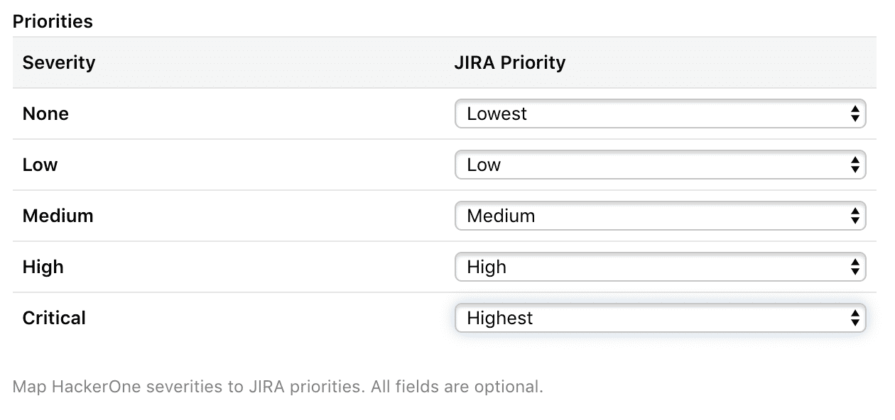 With severity to priority mapping, Jira users can map HackerOne severity ratings to the priority fields they have in Jira. This enables the right priority to be set when escalating a report to Jira.