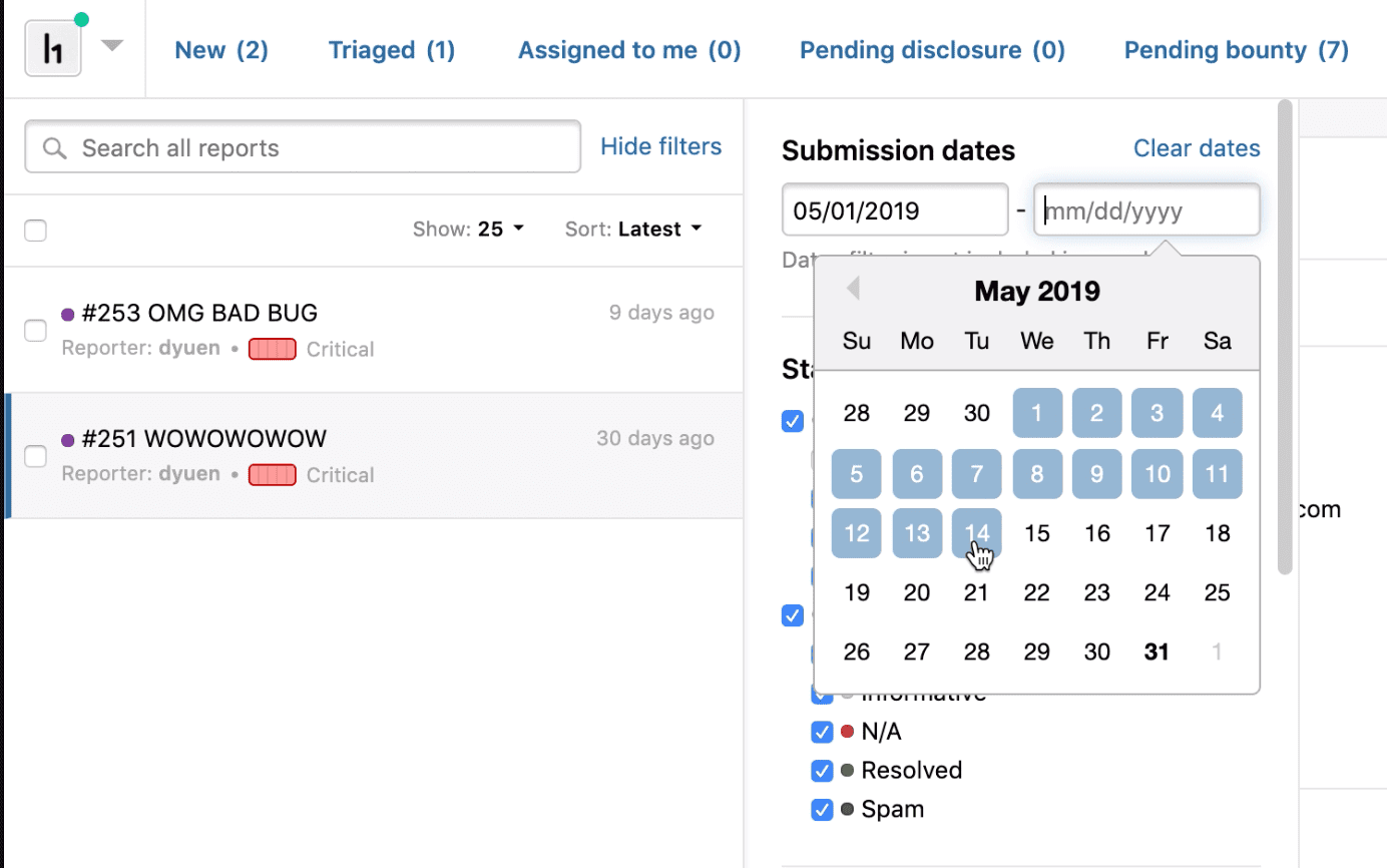 You can now filter through your inbox reports by submission date in order to quickly find reports submitted after or within a certain time.